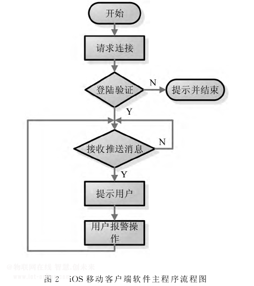 首先進入移動端程序,用戶需要登錄對應賬戶。移動端通過WLAN/GPRS實時接收報警管理服務器端發(fā)送的報警消息,如有報警消息,用戶可根據(jù)不同的報警消息采取相應的報警操作。如果當前報警操作已完成,則再次進入接收推送消息的狀態(tài)。按照上述方式,程序循環(huán)執(zhí)行,圖2給出了軟件主程序流程圖。