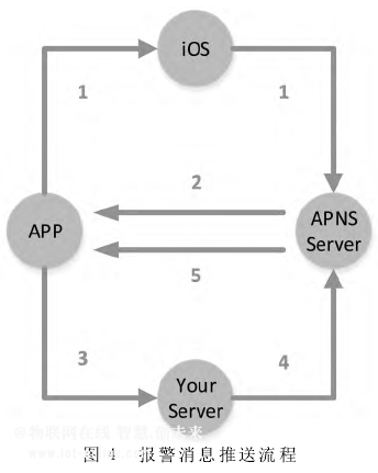 該移動客戶端使用iOS消息推送機制實現(xiàn)報警消息的推送,該消息推送機制是在應用程序APP、APP服務端(YourServer)與APNS(ApplePushNotificationService)服務器之間完成的。消息推送流程如圖4所示,推送流程功能說明如下: